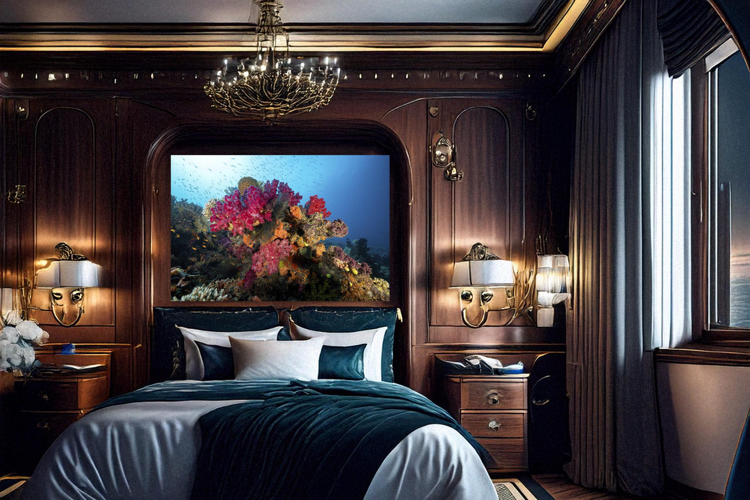 Below the surface, the reef unfolds in layers of color and motion. Branching and rounded corals rise from the seabed in warm reds, purples, yellows, and pinks. Soft corals sway gently with the current, their feathery forms creating a sense of constant movement.
