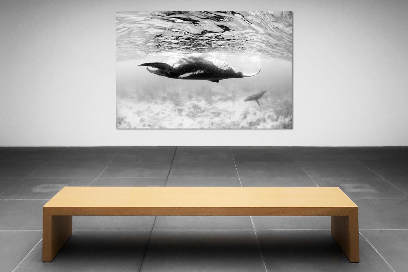 Near the sunlit surface, a female humpback whale twists and rolls in an energetic display of play and possible courtship. In the background, a male lingers—part of the competitive mating dynamic where strength and endurance matter. These interactions, often accompanied by haunting songs, reveal the complexity of humpback social behavior during breeding season in warm tropical waters. This image of humpback whales (Megaptera novaeangliae) was taken 2025 in Rurutu, French Polynesia.